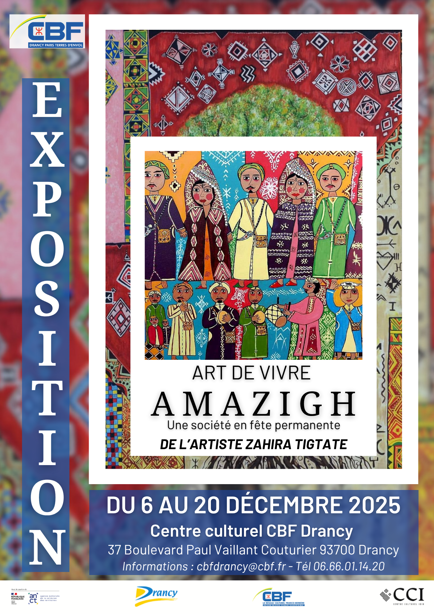 « L’Art de Vivre Amazigh – Une société en fête permanente », une célébration de la culture berbère, une société chleuhe amazigh en fête permanente. Cette exposition invite le public à découvrir un univers riche en couleurs et en symboles, témoignage vibrant du patrimoine millénaire berbère. Du 6 au 20 décembre 2025 – au Centre Culturel CBF de Drancy