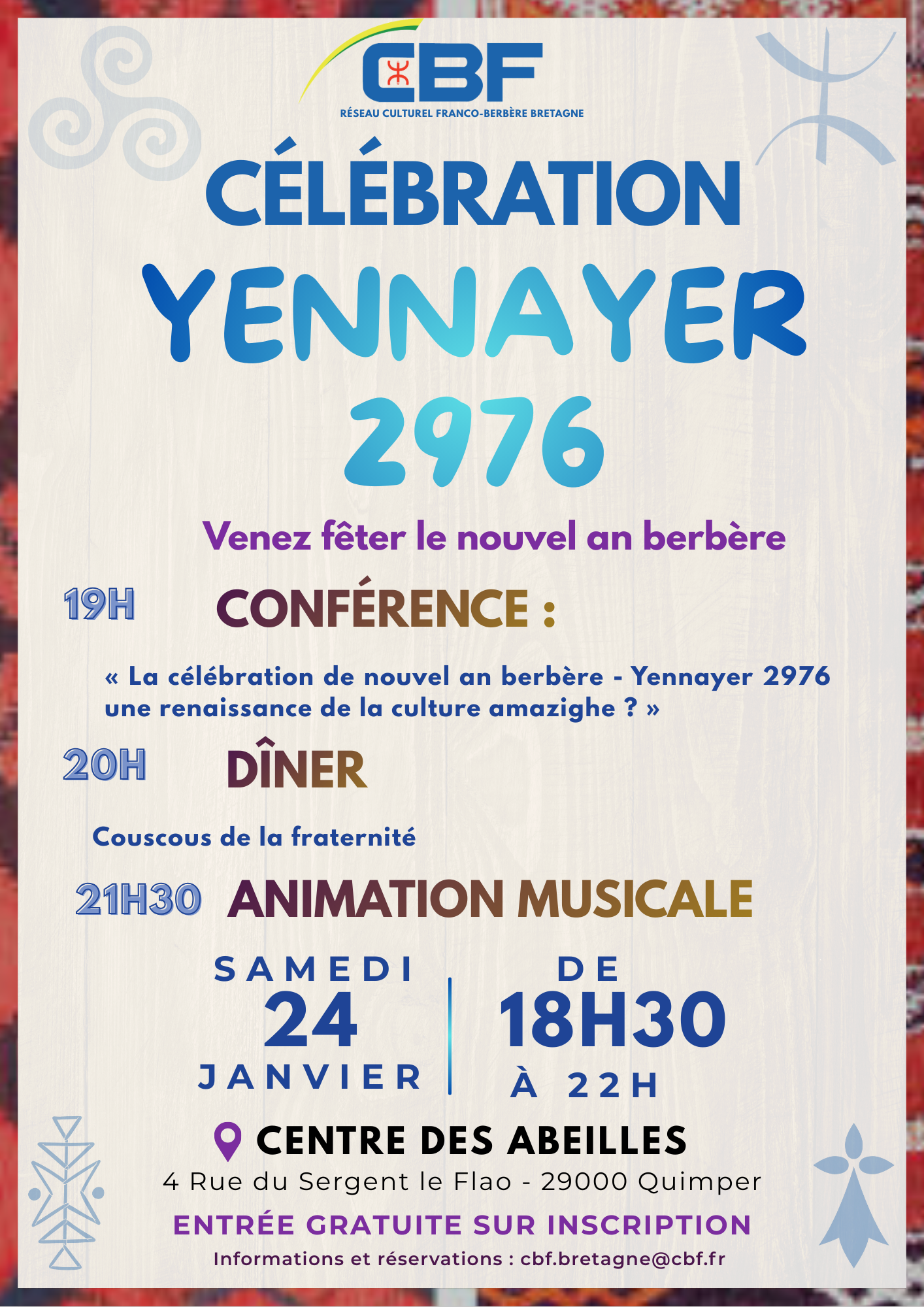 L’entrée est gratuite sur inscription préalable via le lien : https://my.weezevent.com/celebration-yennayer-2976-centre-des-abeilles-quimper
